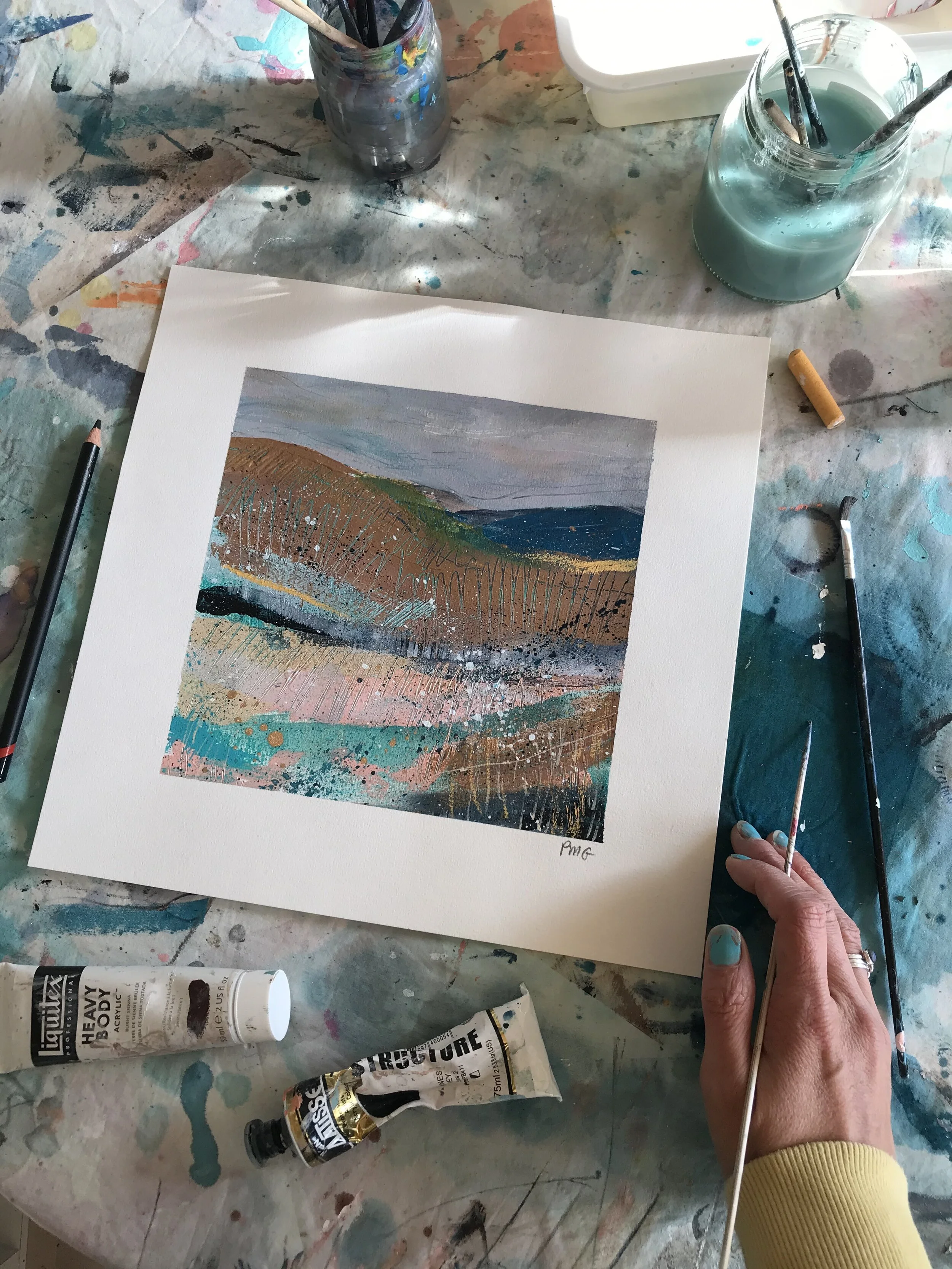 My guest today is mixed media artist Phoebe Gander. Phoebe paints semi-abstract landscapes and seascapes that are rich with layers and textural details. Originally from England, Phoebe now lives in New Zealand with her husband and three children.